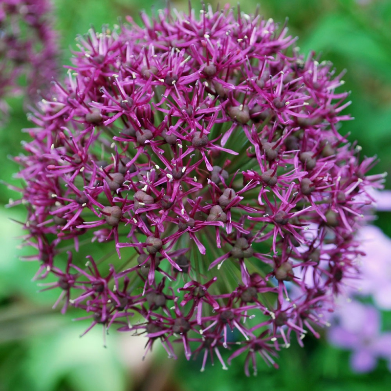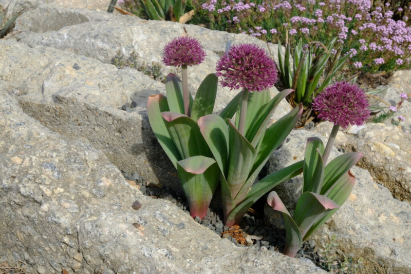 Tento nádherný cesnak s bujnými, dlhotrvajúcimi, modro-šedými listami a veľkými, červenkasto fialovými guľami kvetov na zelených stonkách zostáva okrasný až do leta.