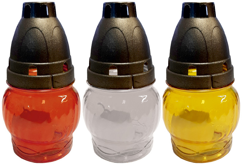 Dekoratívny sklenený kahanec s klasickým dizajnom, dostupný v červenej, čírej a žltej farbe. Vrchnák chráni plameň pred vetrom, vďaka čomu je vhodný na použitie v exteriéri – na cintorínoch či pamätných miestach.