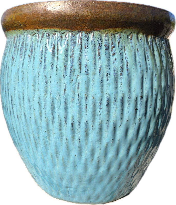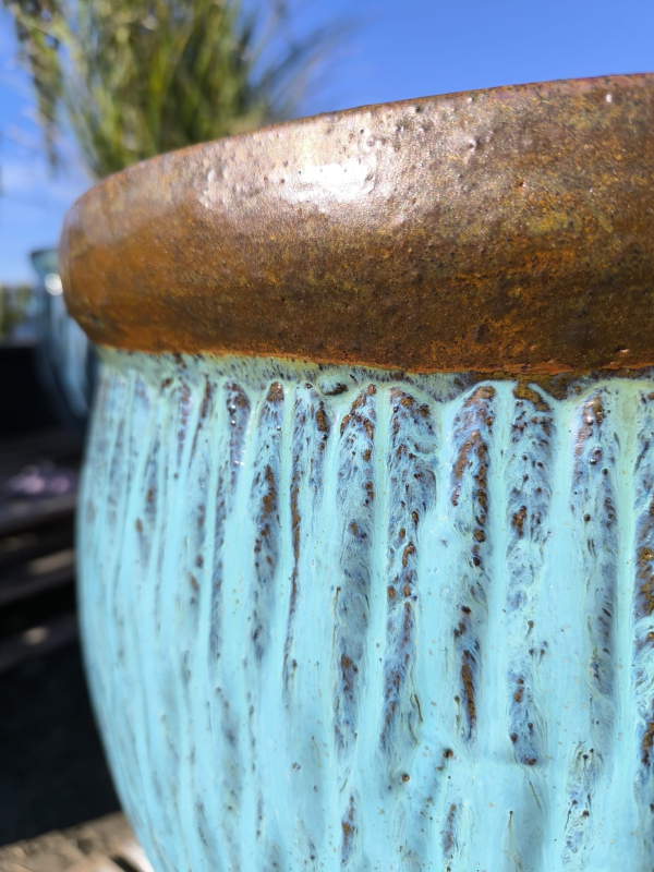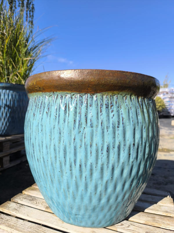 Dekoratívny keramický kvetináč v tyrkysovo-modrom prevedení s rustikálnym hnedým okrajom. Vďaka svojmu elegantnému dizajnu sa hodí na pestovanie kvetov, tráv či menších drevín a stane sa štýlovým doplnkom terasy alebo interiéru.