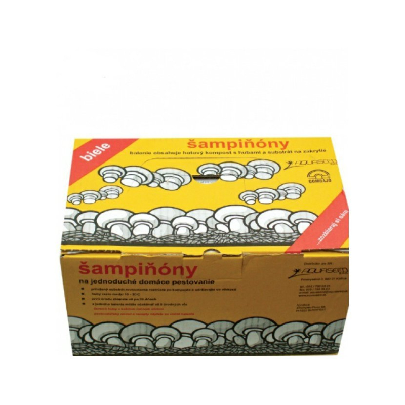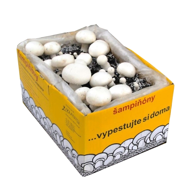 Šampiňóny, hotový naočkovaný substrát - žltá krabica ,na jednoduché domáce pestovanie. Priložený substrát rovnomerne roztrúste po komposte a udržujte vo vlhkosti. Huby rastú medzi 10-20 stupňami Celzia. Prvú úrodu zbierate už po 20-tich dňoch. Z jedného balenia môžete očakávať až 5 úrodných vĺn. Čerstvé huby v každom ročnom období!