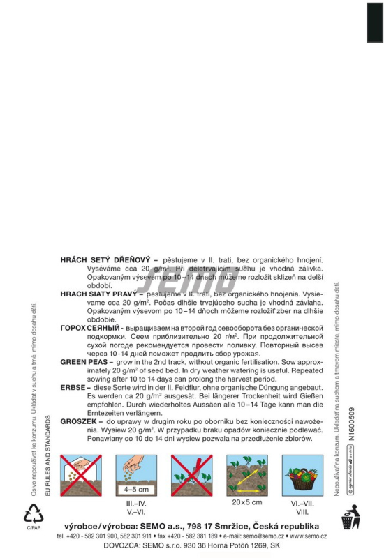Výrobca: SemoHrach siaty Cedrik je neskorá, veľkozrnná odroda záhradného hrachu poskytujúca veľmi lahodné tmavozelené hrášky. Rastliny sú vyššieho vzrastu. Struk je široký, tupo zakončený, dlhý 8 cm a obsahuje 7 až 8 zŕn. Je rezistentný na PEMV (Vírusová mozaika hrachu), PSbMV (Pea Seed-Borne Mosaic Virus), Fusarium rasa 1, 2 a múčnatke.