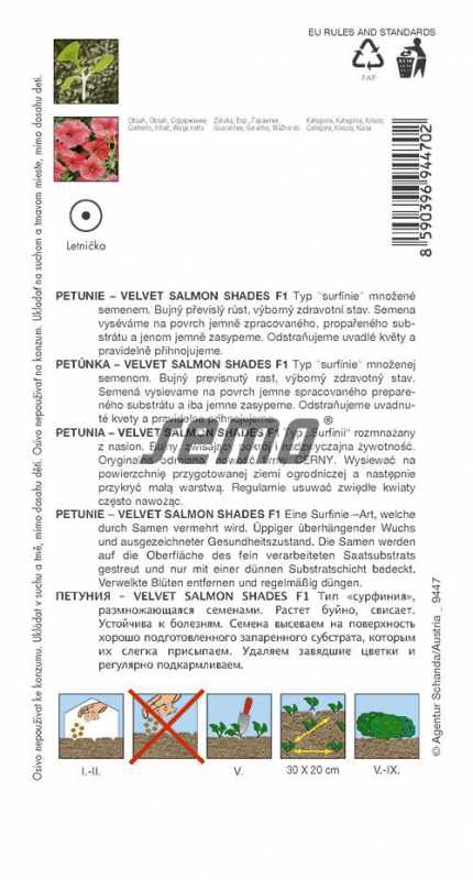 Výrobca: SemoObľúbená letnička vhodná do okenných hrantíkov aj k záhonovým výsadbám. Vyžaduje slnečnú, teplú polohu a výživnú humóznu pôdu. Neznáša veterné stanovište. Semeno sejeme na povrch jemne spracovaného prepareného substrátu a len veľmi slabo zasypeme. Po troch týždňoch prepikýrujeme a následne rozsadíme do hrnčekov. V priebehu vegetácie odstraňujeme uvädnuté kvety a pravidelne prihnojujeme. Prevísajúci rast, farba kvetov lososová.