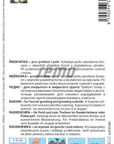 Výrobca: SemoReďkovka Belana F1 je skorá hybridná reďkovka s guľatými buľvičkami snehovo bielej farby. Belana má väčšie, veľkostne aj tvarovo vyrovnané buľvičky odolné voči praskaniu i vyšepkaniu. Jej vňať je tmavá, stredne nízka. Táto nová hybridná reďkovka je tiež veľmi odolná k vykvitaniu a môžeme ju tak odporučiť na celoročné pestovanie, vrátane najskorších jarných i problematických letných výsevov.