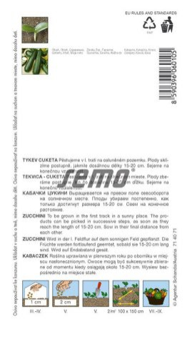 Výrobca: SemoHybridná skorá až veľmi skorá cuketa. Plody sú valcovité, hladké sýto tmavo zeleno sfarbené, dlhé priemerne asi 20 cm. Nemajú sklon k rýchlemu prerastaniu. Kríček je stredne vzrastný a vzpriamený, otvorený habitus rastliny uľahčuje zber. Prvé plody je možné žať za 40 – 45 dní po výseve.