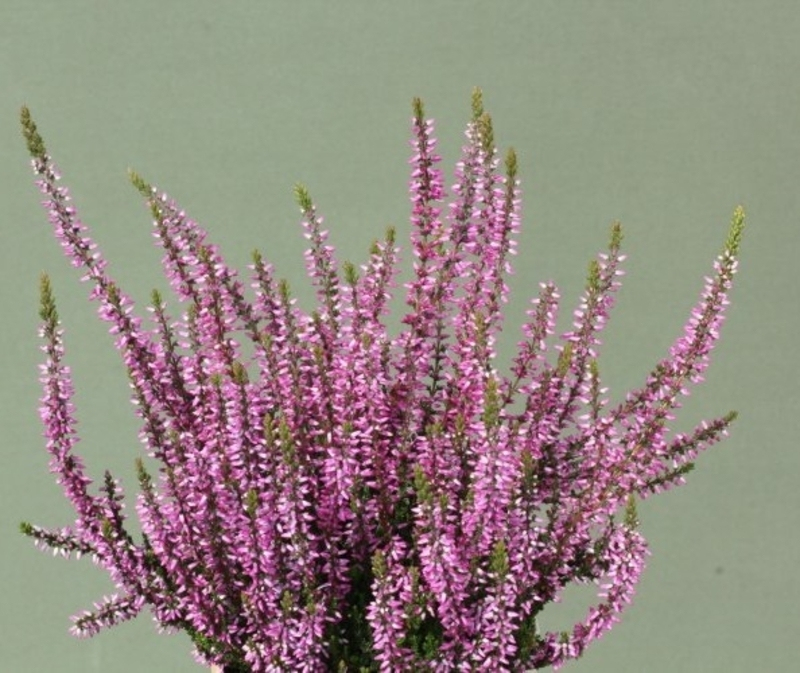Vres obyčajný ´Dunja´ kvitne od augusta až do októbra, ružové kvety vytvárajú pôsobivý kontrast k žiarivo zeleným ihličkám.